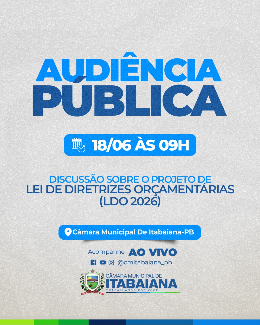 A Câmara Municipal de Itabaiana-PB, por meio da Casa Dr. Antônio Batista Santiago, convida toda a população para participar da Audiência Pública que será realizada no próximo dia 18 de junho, às 9h, no plenário da Câmara. O encontro terá como tema central a discussão do Projeto de Lei de Diretrizes Orçamentárias (LDO) para o exercício de 2026.